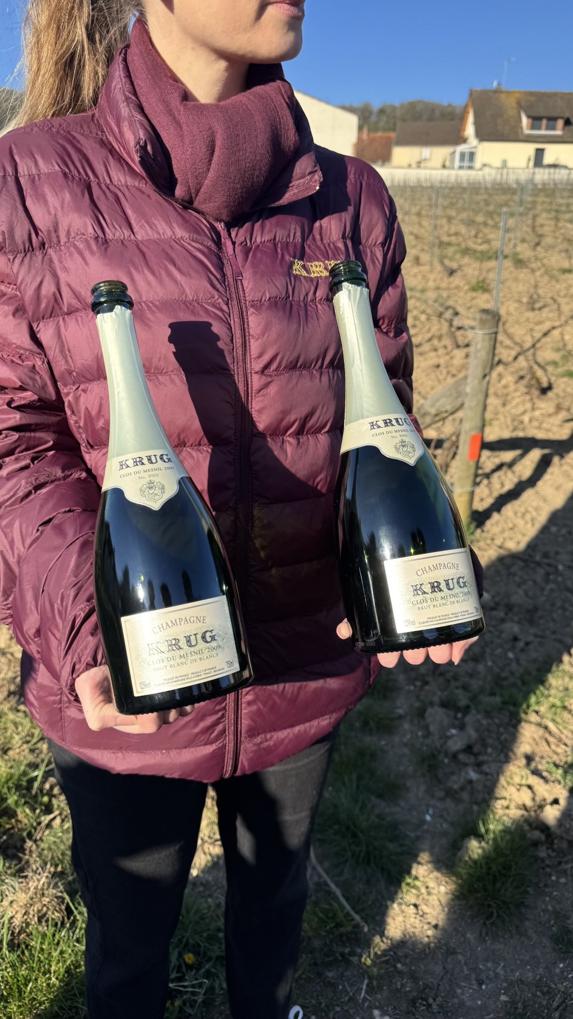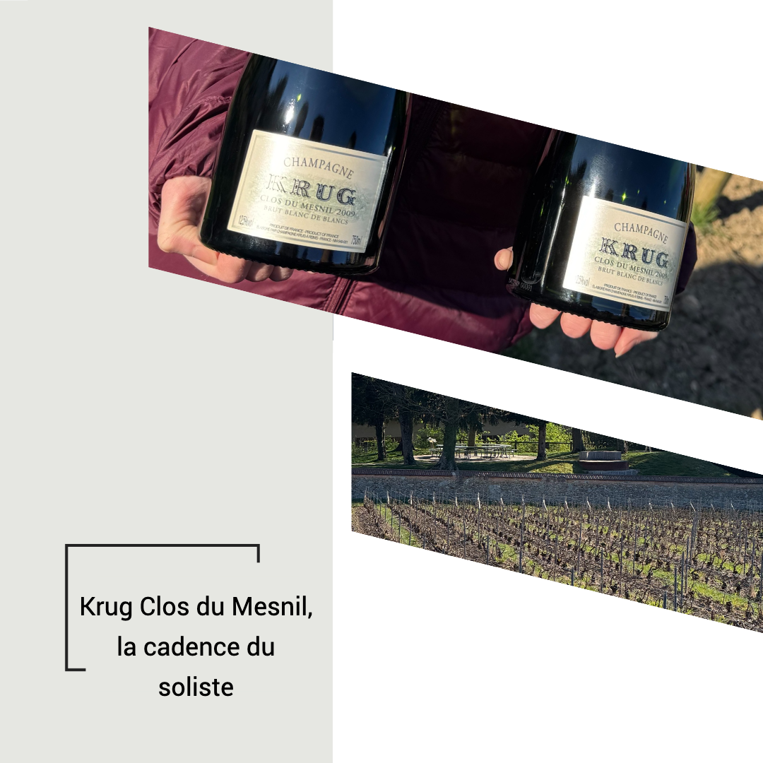 Krug Clos du Mesnil 2009 — dégusté dans le Clos du Mesnil, à 9h du matin, expérience incroyable ! L’année 2009 a été marquée par un hiver rigoureux, suivi d’un printemps doux qui a vu l’éclosion des bourgeons à la mi-avril. Les tempêtes de mai à juillet ont laissé place à un été idéal, avec un climat chaud et sec, et des nuits fraîches jusqu’aux vendanges. Les sols de craie pure du Mesnil ont su tempérer la maturité et les vendanges au Clos du Mesnil ont eu lieu les 10 et 11 septembre 2009. Après 15 ans de maturation sur lies, le voici devant nous. La robe est d’or pâle à reflets verts, l’effervescence fine et persistante. Le nez est séduisant mais résiste légèrement : des agrumes confits (zeste de citron, orange amère) avec quelques notes plus fraîches qui émergent progressivement à l’aération. C’est encore très jeune, serré, comme si le vin résistait un peu à livrer tous ses secrets d’un coup. En bouche, la densité est saisissante, la mâche tapisse tout le palais. L’acidité est précise et structurante, des amers nobles en finale, une salinité minérale qui rappelle que l’on est sur de la craie pure, et une persistance qui s’étire longuement. Ce 2009 est encore très jeune pour son âge, il a la tension d’un vin qui n’a pas encore dit la moitié de ce qu’il a à dire. On y pressent la complexité à venir : cire, agrumes séchés, cette profondeur qui caractérise les grands Mesnil avec le temps. Un champagne qui exige la patience.