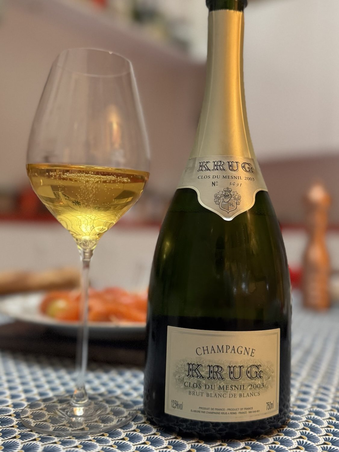 Quelques semaines plus tard, grâce à un grand amateur de vin, j’ai eu la chance de déguster un millésime plus ancien : le Krug Clos du Mesnil 2003. Autant le dire d’emblée : 2003 est un cas à part dans l’histoire du Clos. L’année de la canicule, la plus chaude depuis 1540 selon certaines sources, a mis la Champagne à rude épreuve : un hiver et un printemps très secs et une floraison précoce suivie de deux gelées sévères et d’un été caniculaire conduisant à des vendanges fin août. La maison évoque dans ses notes un contraste saisissant entre la violence du millésime et l’expression équilibrée, presque fraîche, du chardonnay du Clos.