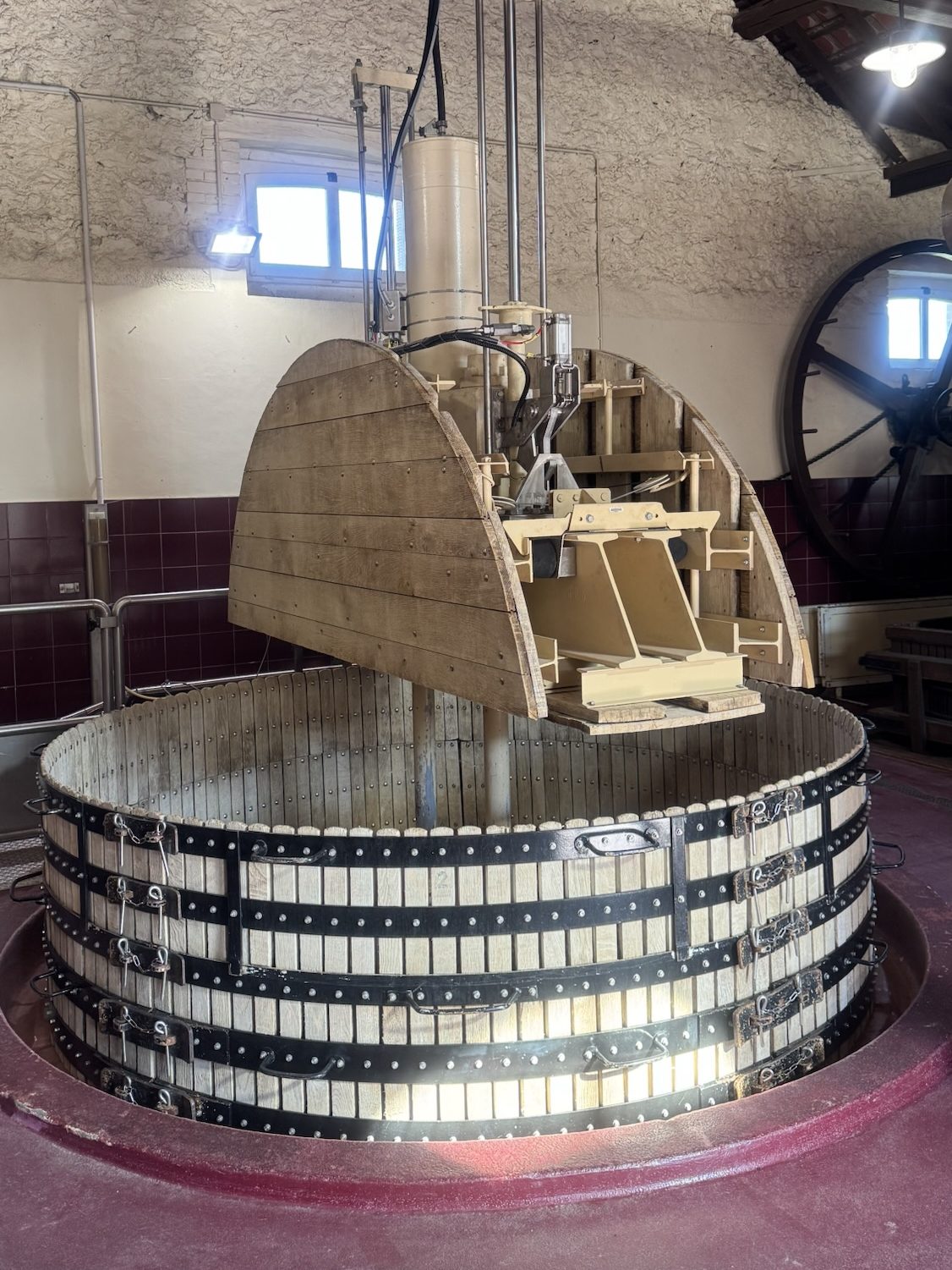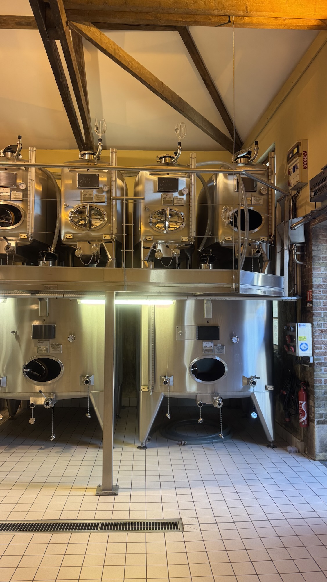 Une fois les raisins récoltés, tout est maîtrisé sur place avant que les jus ne rejoignent le site principal : le pressurage est réalisé au clos même, dans un pressoir Coquard de 4000 kg, à raison de deux pressurages par jour, chacun prenant environ cinq heures nettoyage compris. Un pressurage lent, doux, qui respecte la matière. Les jus passent ensuite 24 heures en cuves dans la partie supérieure du cuvier, puis descendent par gravité dans des cuves basses, où ils sont ensemencés aux levures indigènes avant de rejoindre les fûts.
